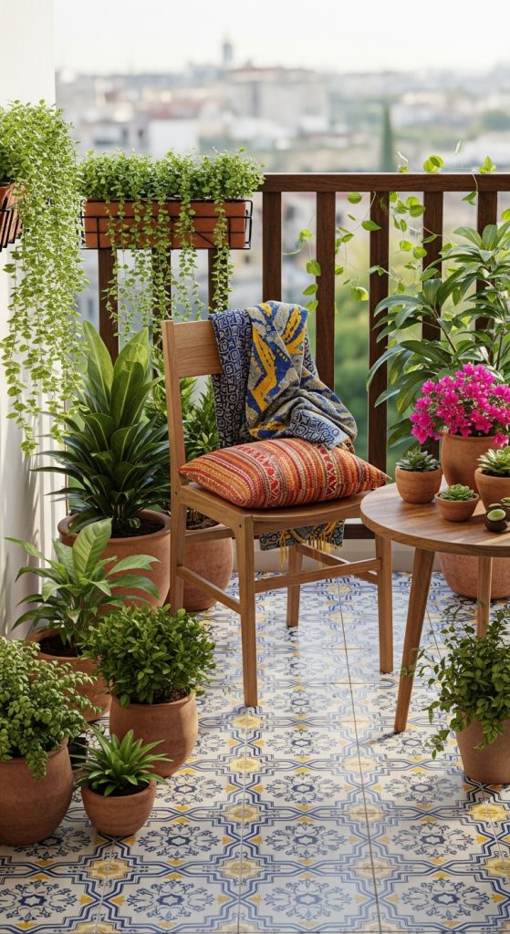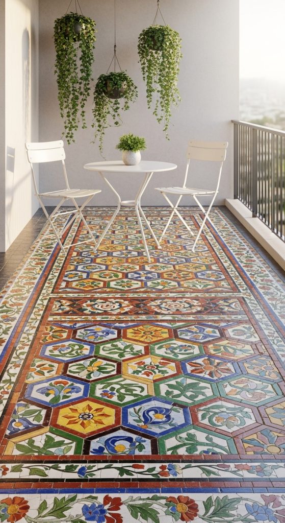 If you love color and bold design, patterned ceramic tiles can instantly transform your balcony into a vibrant, energetic space. From Moroccan-inspired motifs to geometric modern patterns, there are endless options to choose from.
