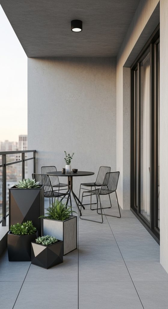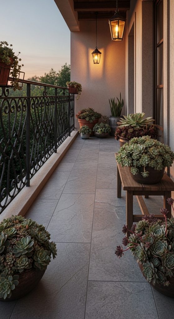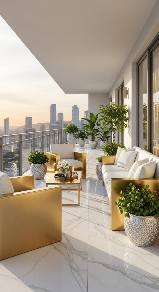 Choose light shades like white, beige, or ivory for a classic and airy look, or opt for darker tones like black or emerald for a more dramatic appeal. These tiles work especially well in modern apartment balconies. Add metallic planters or minimalist furniture to complete the high-end aesthetic.