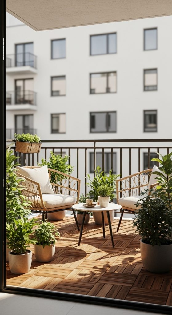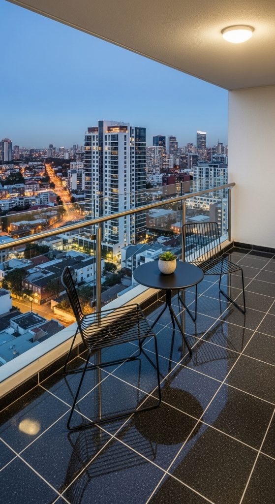 You can choose porcelain tiles that mimic marble, wood, or stone for a custom look. Their sleek surface reflects natural light beautifully, making small balconies appear more spacious. With minimal maintenance required, porcelain tiles are both functional and fashionable.