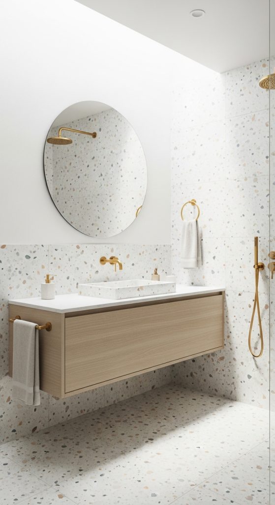 Terrazzo is making a major comeback in modern bathroom design. Originally popular in the mid-20th century, terrazzo tiles feature chips of marble, quartz, or glass embedded in cement or resin, creating a speckled, colorful surface.