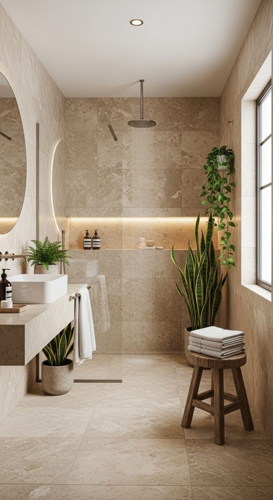 Natural stone tiles like travertine, slate, and limestone bring earthy elegance to bathrooms. Their organic texture and muted tones create a sense of warmth and calm, reminiscent of luxury spas.