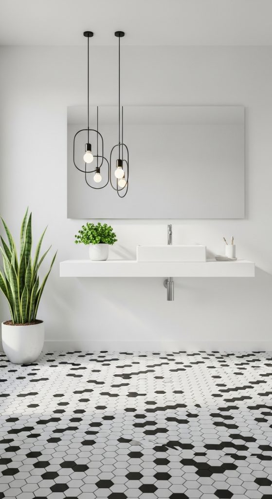 Use geometric tiles in neutral colors like white, black, and gray for a sophisticated look, or go bold with contrasting colors for a striking statement. A hexagonal floor paired with plain walls creates a perfect balance of pattern and simplicity.