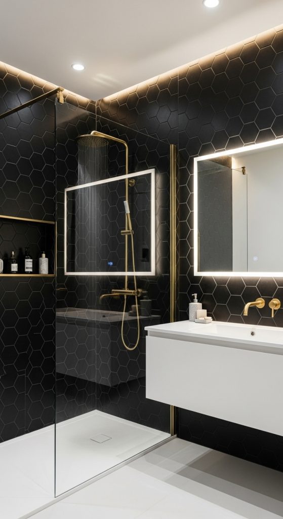 Combine matte black tiles with white grout for contrast, or pair them with brass fixtures for a touch of glamour. To avoid making the room feel too dark, balance the black tiles with plenty of lighting and reflective surfaces like glass or mirrors.