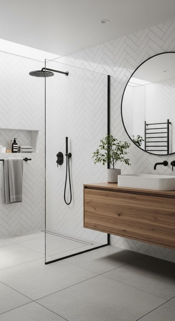 Wood-look porcelain or ceramic tiles offer the warmth and charm of natural wood without the maintenance issues associated with moisture. They’re perfect for those who love rustic or Scandinavian-style bathrooms.
