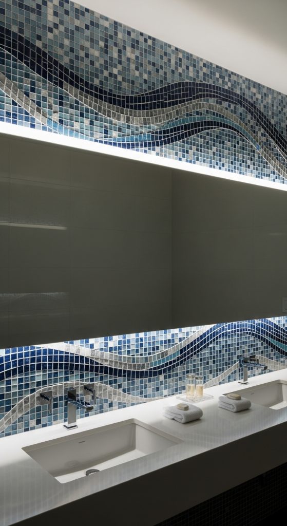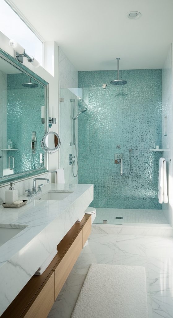 Use glass tiles in shower walls or around mirrors to amplify light. For a subtle shimmer, choose frosted glass tiles in shades of aqua or sea green. For a bolder look, go for metallic or mirrored finishes that add a touch of luxury.