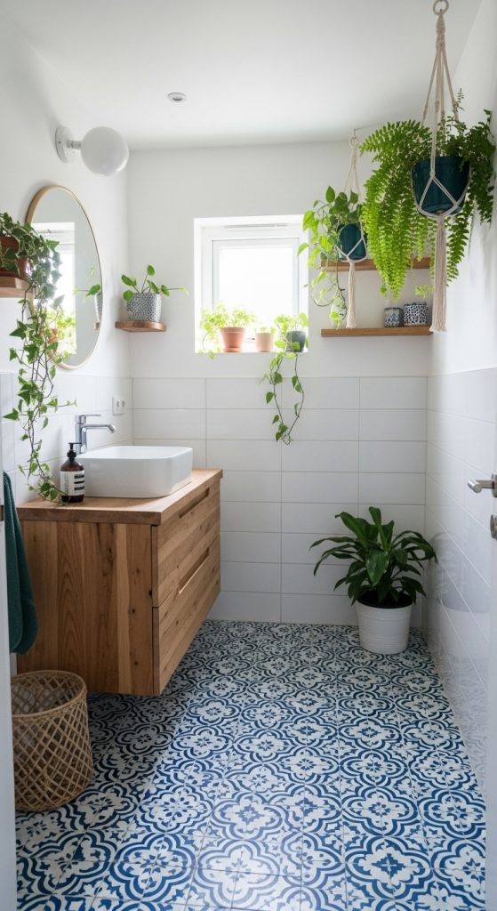 Use patterned tiles on the floor while keeping walls neutral for balance. Alternatively, create a backsplash behind the vanity using colorful Moroccan or Mediterranean-inspired patterns for an eclectic touch.