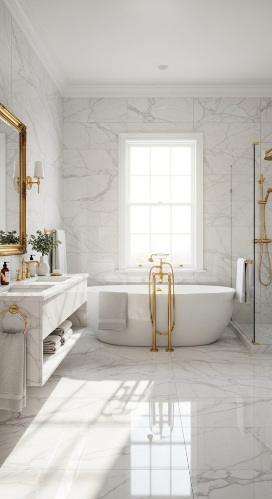 Use large-format marble tiles on both the floors and walls for a seamless look. White marble with subtle gray veins, such as Carrara or Calacatta, works beautifully with minimalist or classic interiors. For a more dramatic effect, consider darker tones like Nero Marquina marble.