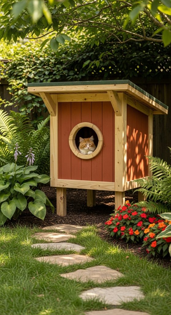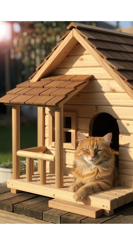 You can use plywood or repurposed wooden pallets to keep the cost low. The design usually includes four walls, a slanted roof to let water run off, and a small doorway for your cat. Adding insulation or straw bedding will make it warm for winter months. You can even paint the exterior to match your garden or deck for a stylish look.