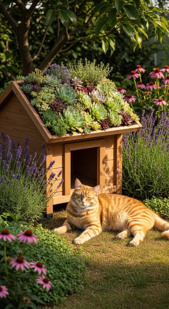 This design not only provides your cat with a cozy place but also adds a decorative and eco-friendly touch to your backyard. The green roof helps regulate temperature inside the house, keeping it cooler in summer and warmer in winter.
