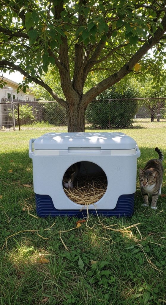 An unused cooler can be turned into a cozy cat shelter with minimal effort. Simply cut an entry hole on one side, add insulation inside, and fill it with straw or blankets. Since coolers are already insulated, they naturally retain warmth.