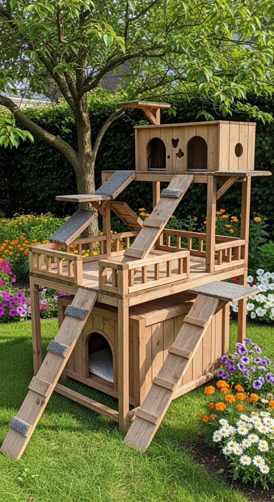 If you have multiple cats or a very active feline, a multi-level cat house is a dream come true. This design features two or more levels connected by ramps or small steps. The bottom level serves as a cozy sleeping area, while the top levels can be open platforms for lounging and watching the surroundings.