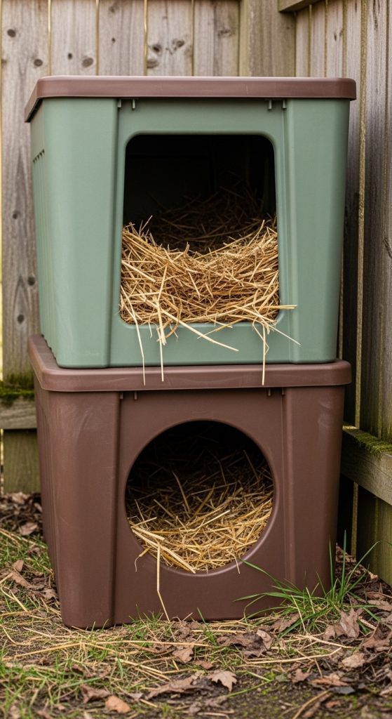 A very budget-friendly idea is to create a cat house using large plastic storage totes. You will need two totes, one slightly smaller than the other. Cut an entry hole in both, then place the smaller tote inside the larger one with insulation between them. This double-layered structure keeps the cat warm and dry.