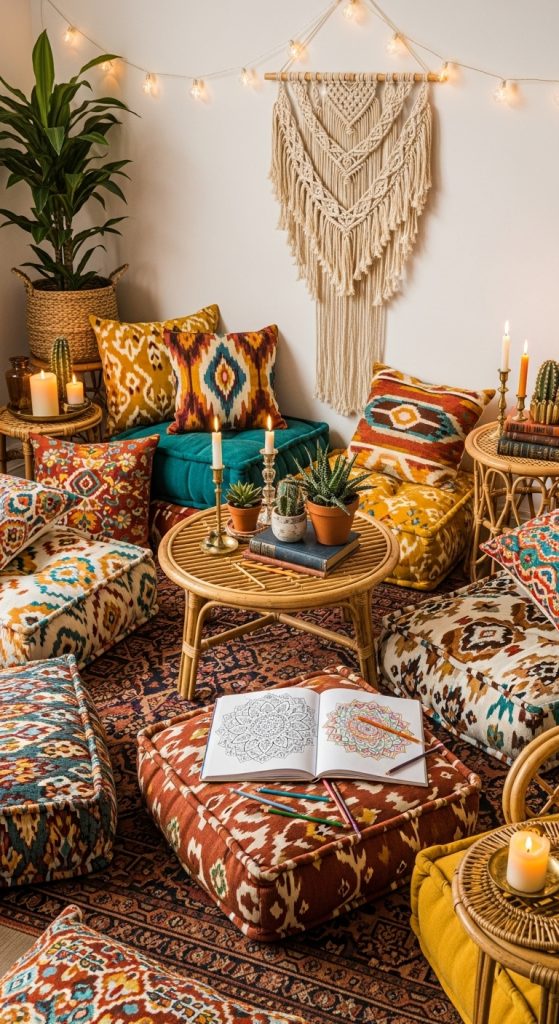 The bohemian corner celebrates artistic freedom and individuality, making it a magical place to unwind and color.