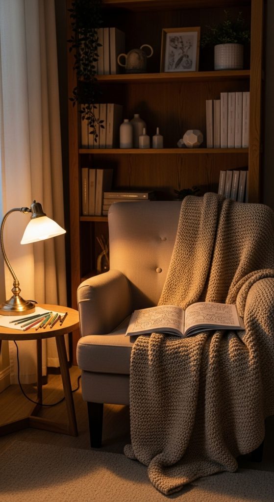 Warm lighting makes a huge difference. Use a floor lamp with a soft, amber glow to create an inviting atmosphere. You can also place a candle or diffuser on the side to add a pleasant scent. This corner becomes a peaceful retreat for both reading and coloring sessions.