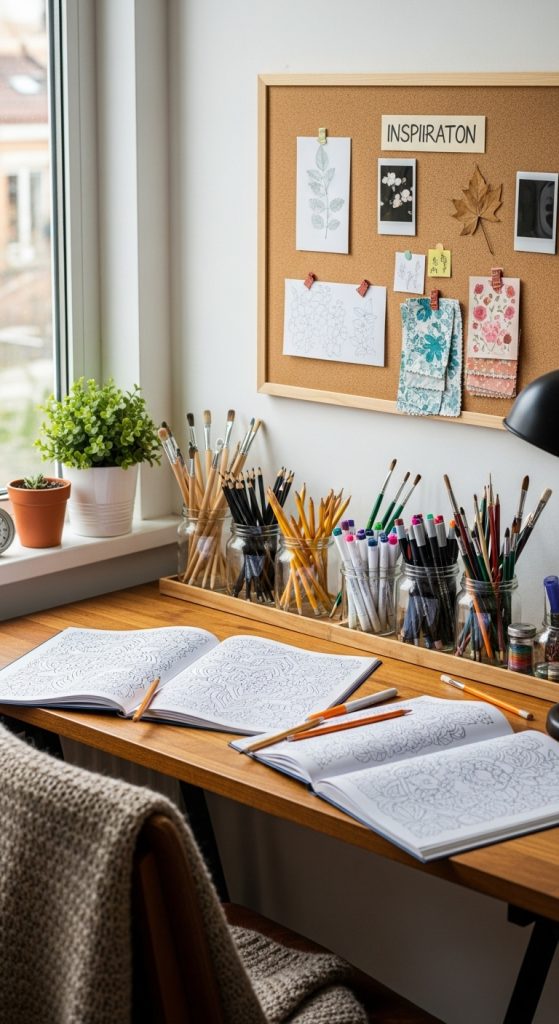 Add an inspiration board or corkboard above your desk where you can pin your favorite coloring pages or color palette ideas.