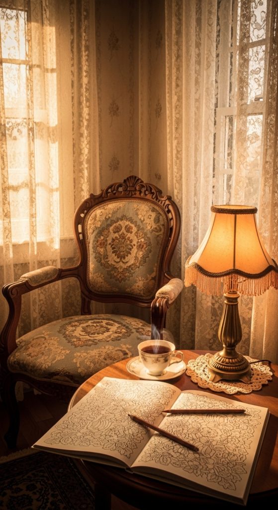 If you love a touch of nostalgia, a vintage inspired cozy corner can make your coloring time feel timeless. Look for an antique armchair or a thrifted wooden chair with character. Pair it with a lace tablecloth, an old-fashioned lamp, and a patterned rug for warmth.