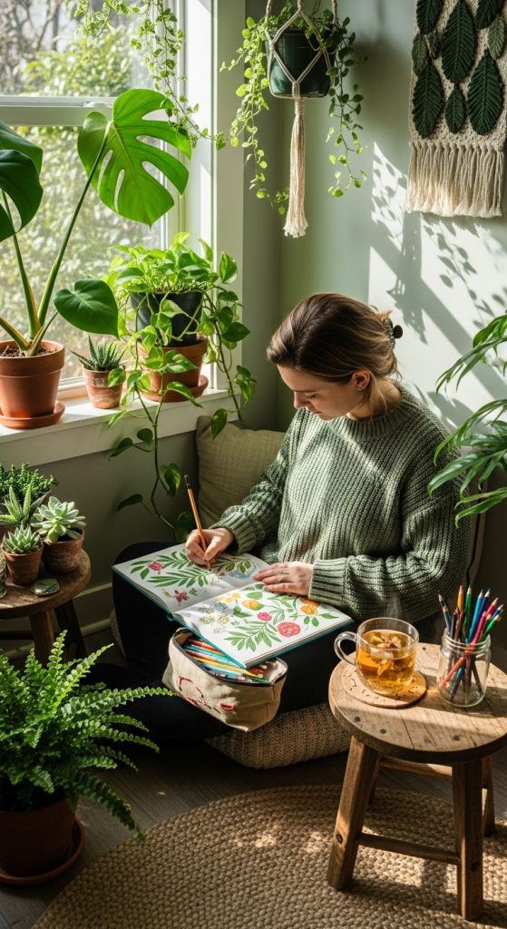 If you love nature, bring the outdoors inside by creating a cozy coloring space surrounded by greenery. Place your cozy corner near a window where sunlight filters in. Add potted plants like ferns, succulents, or ivy around your chair. The natural greenery creates a fresh and calm environment, which enhances your coloring experience.