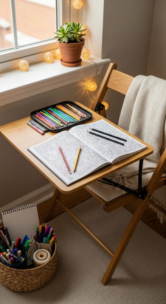 Even if you live in a small apartment or dorm, you can create a beautiful coloring space with minimal effort. Use a folding chair or window seat, a lap desk, and a basket or box to store your supplies.