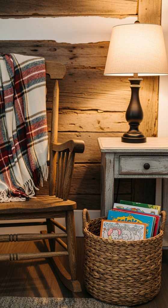 For those who love rustic charm, a farmhouse themed coloring corner can be incredibly soothing. Use a wooden chair or rocking chair, a woven basket for your coloring tools, and a plaid or linen throw. Add soft lighting from a table lamp or lantern and some dried flowers in a vase.