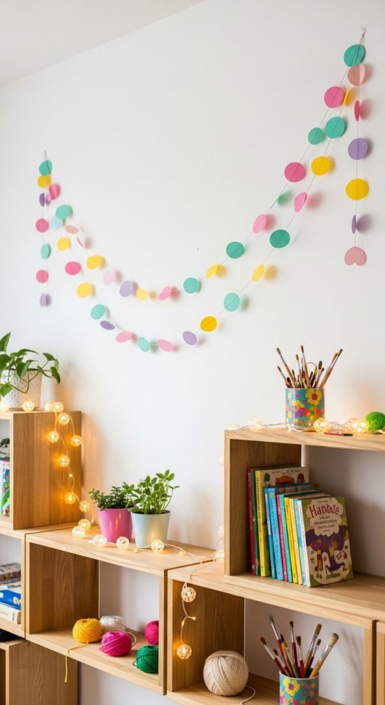 A pastel garland can bring a fun, cheerful touch to your room, especially for nurseries, creative studios, or seasonal decorating.