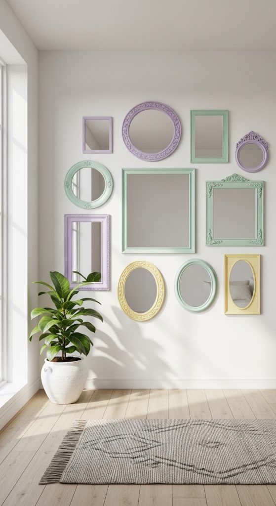 Use multiple small mirrors with different pastel frames to create a statement wall. This works perfectly in entryways or bedrooms.