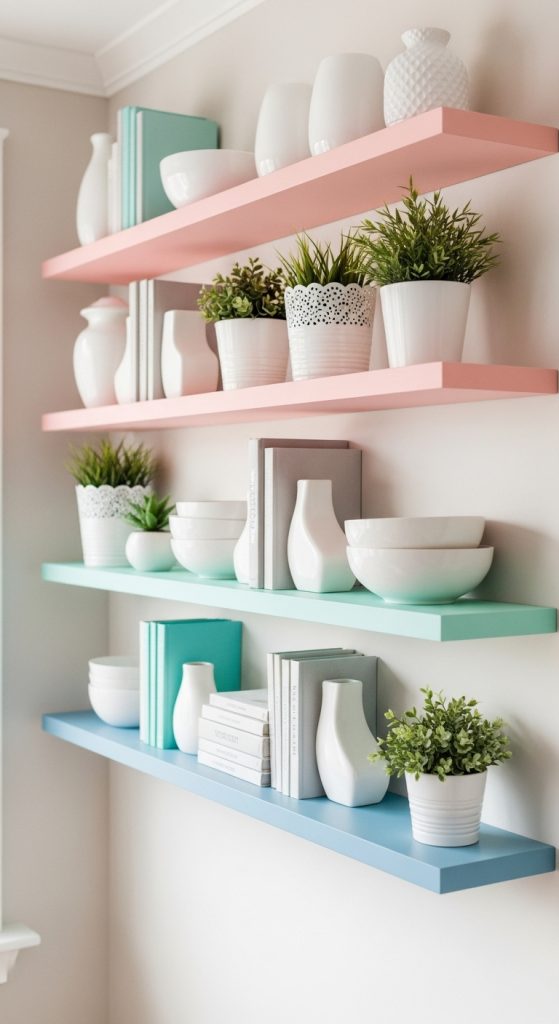 Display minimal objects on your pastel shelves—like white vases, books, or small plants—to keep the focus on the soft colors and avoid clutter.