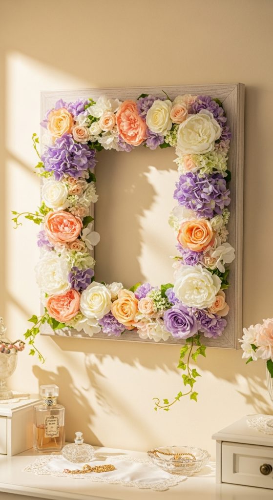 Take a photo frame and remove the glass. Arrange artificial flowers in soft pastel shades like peach, lilac, and cream inside the frame. Secure them using hot glue. You can leave the center open or fill it completely for a lush effect.