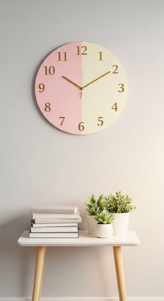 Purchase a plain wooden or plastic wall clock. Paint the base with pastel shades using acrylic paint. You can go for a single color or a half-and-half design—like pink and white or mint and cream. Add gold or white numbers for contrast.