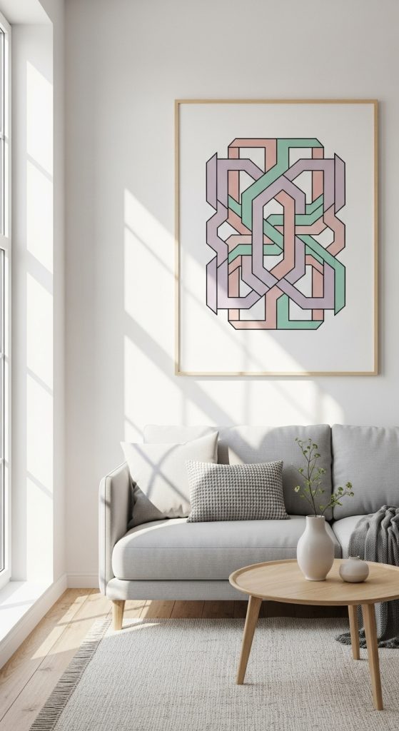 Frame your artwork in a simple wooden or gold frame to add polish. This type of decor works beautifully in minimalist or Scandinavian-inspired spaces.