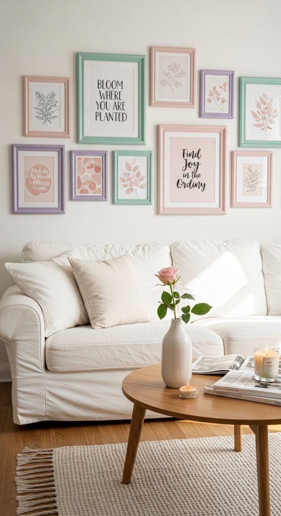 Collect different-sized frames and paint them in coordinating pastel tones. Fill them with your favorite prints, botanical sketches, or minimalist quotes in soft colors. Arrange them on the wall in a balanced composition.