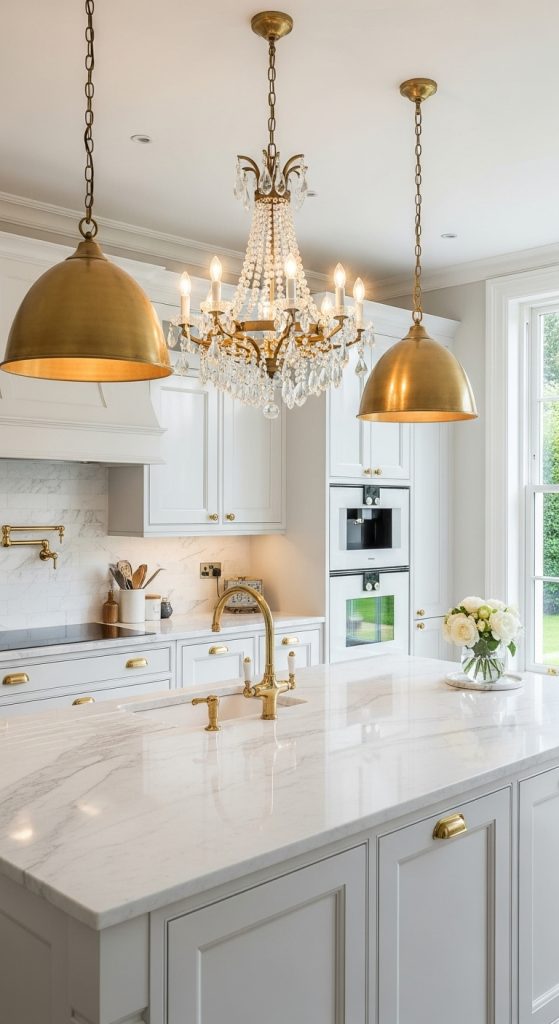 • Add statement lighting such as crystal chandeliers or gold pendant lights.