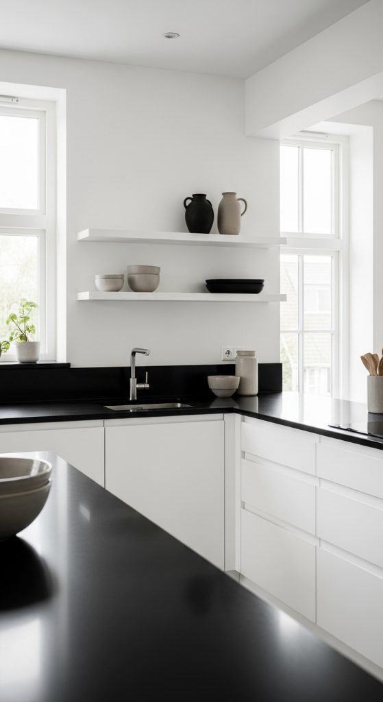 • Choose neutral colors such as white, black, or grey for cabinets and countertops.