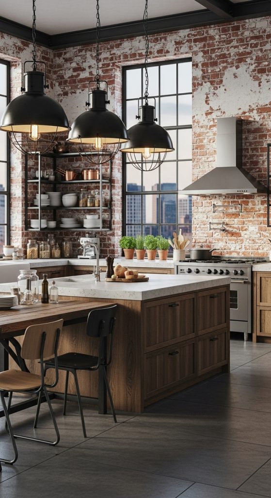 • Choose industrial-style lighting such as pendant lights with black or metal finishes.
