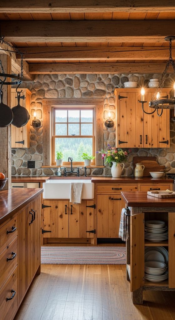 The rustic cabin kitchen embraces nature and raw materials. It creates a warm, earthy atmosphere that feels connected to the outdoors.