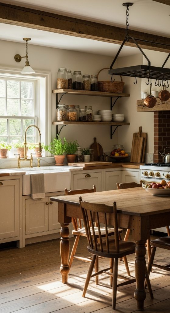 • Incorporate open shelving with vintage jars, baskets, and cookbooks.