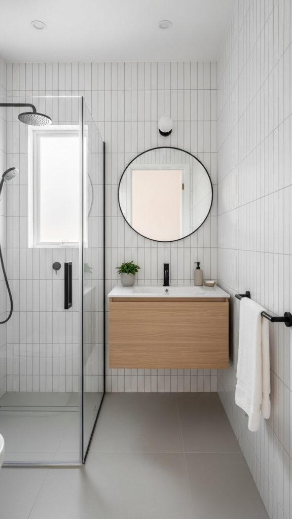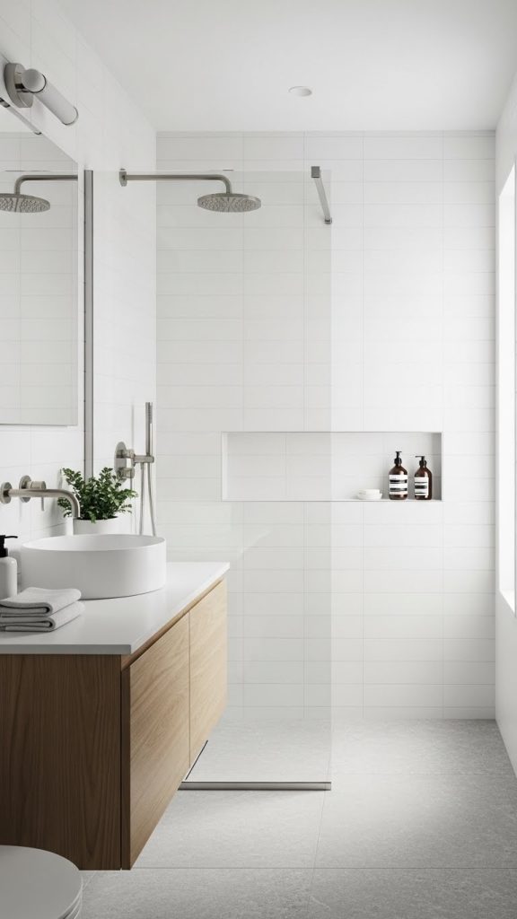 Pairing vertical tile with matte black or brushed nickel fixtures adds modern contrast without overpowering the room. A walk in shower with clear glass panels can further enhance the feeling of openness. Instead of installing heavy shower curtains, choose frameless glass to allow light to travel freely throughout the space. Minimalism is essential, so avoid patterned tiles or bold colors and keep the palette simple.