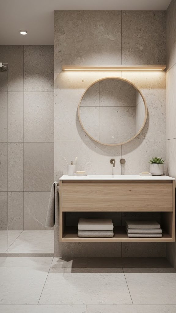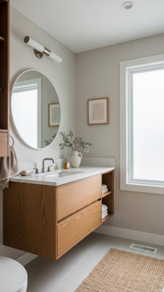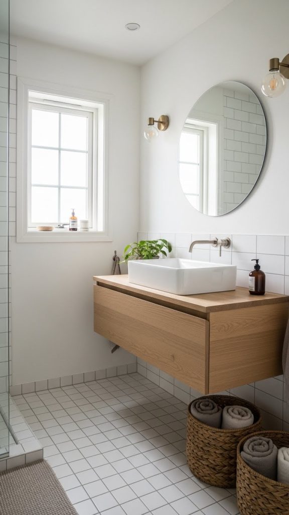 Pairing the vanity with a round or oval mirror adds a soft, organic touch. Mirrors play a significant role in small bathrooms by reflecting light and creating openness. For an even more Scandinavian look, consider a mirror with a thin wood frame or a sleek frameless style.