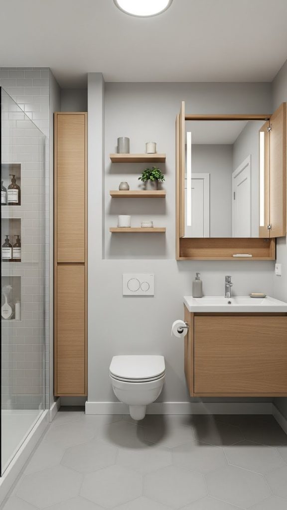 Consider wall mounted cabinets with plain fronts that blend seamlessly into the wall. Medicine cabinets behind mirrors offer practical storage without adding bulk. Recessed shelving inside the shower can keep bottles neatly organized without protruding into the space.