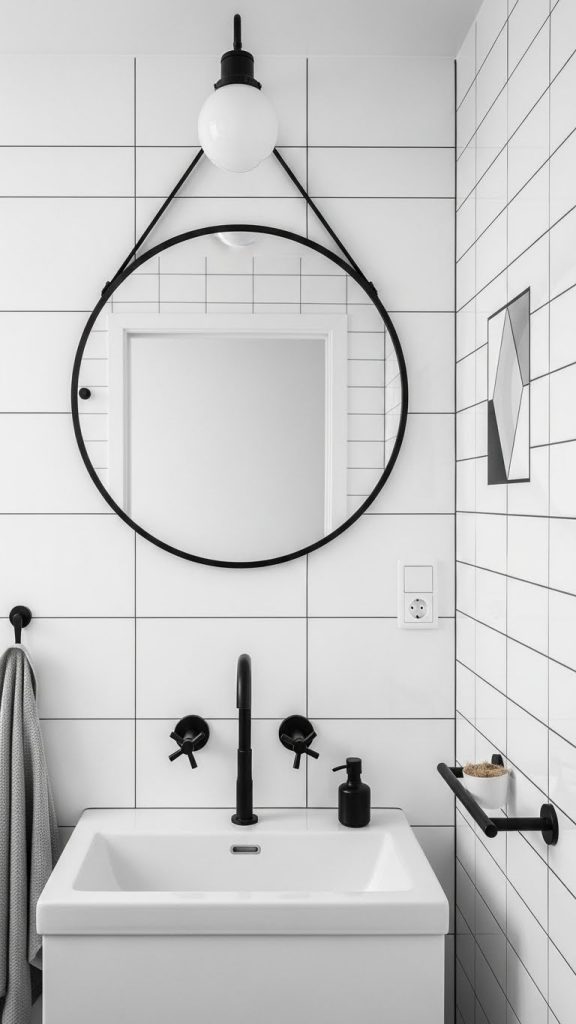 Matte black faucets, towel bars or shower frames make stylish focal points without overwhelming the minimalistic feel. A black framed round mirror or thin black shelves can complete the look while keeping the palette streamlined. The key is to use black sparingly to maintain balance. Too much black can shrink the space, so use it only in accent areas.