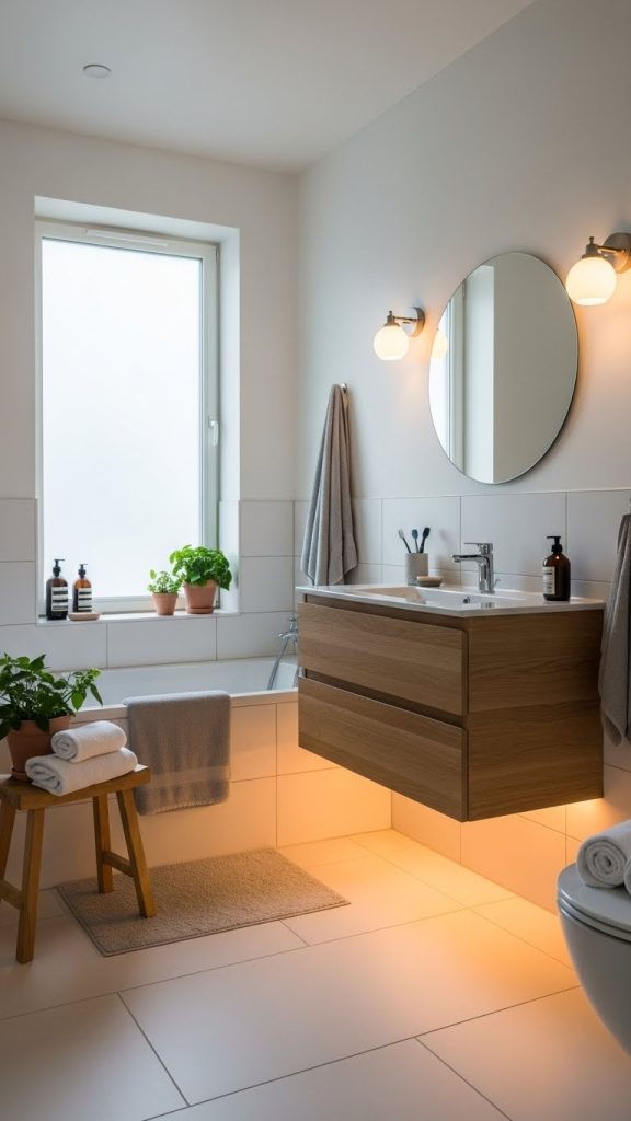 Wall mounted sconces beside the mirror offer flattering lighting for daily grooming. LED strips below the vanity or behind the mirror add a subtle glow that enhances depth without taking up visual space. Warm white bulbs create a soothing ambiance perfect for Scandinavian decor. Avoid bright cool toned lighting that can make the space feel clinical. The goal is to create a comfortable and serene environment with light that feels natural and calming.