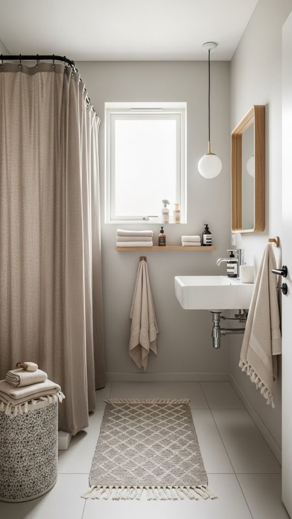 Even in a small Scandinavian bathroom, textiles play an important role in adding softness and comfort. Natural fabrics like linen and cotton complement the minimalist aesthetic without feeling heavy. Towels, bath mats and shower curtains made from natural fibers enhance the cozy Nordic atmosphere.