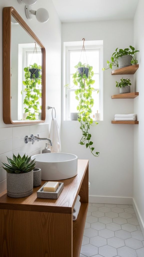 Choose plants that thrive in low light and humidity, such as pothos, peace lily, eucalyptus or small ferns. These plants add vibrancy while remaining low maintenance. If your bathroom has a window, place the plants near natural light. If not, choose artificial alternatives that look realistic.
