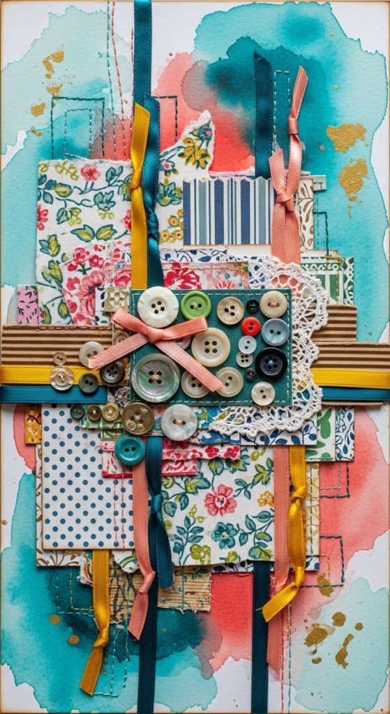 Start with a blank page and layer different materials. You could paint a watercolor background, add fabric swatches, stamp designs, or include 3D embellishments like buttons and ribbons. This style of scrapbooking allows for complete creative freedom.