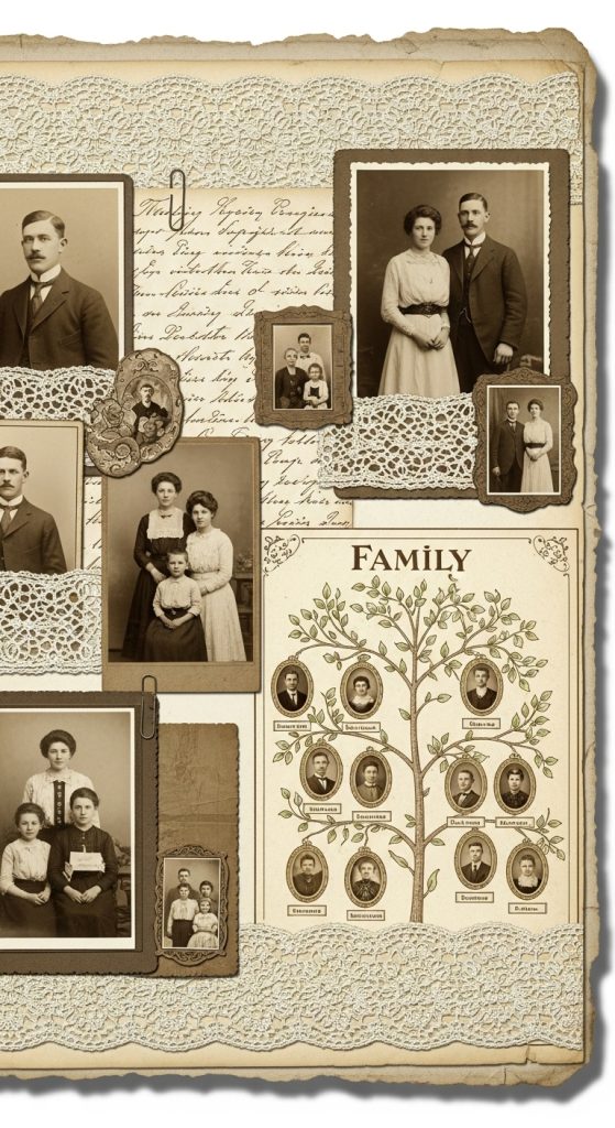 To give your scrapbook an authentic, vintage look, use aged paper, sepia-toned photos, lace, or antique-style embellishments. You could also create a family tree chart within your scrapbook to connect relatives across generations.
