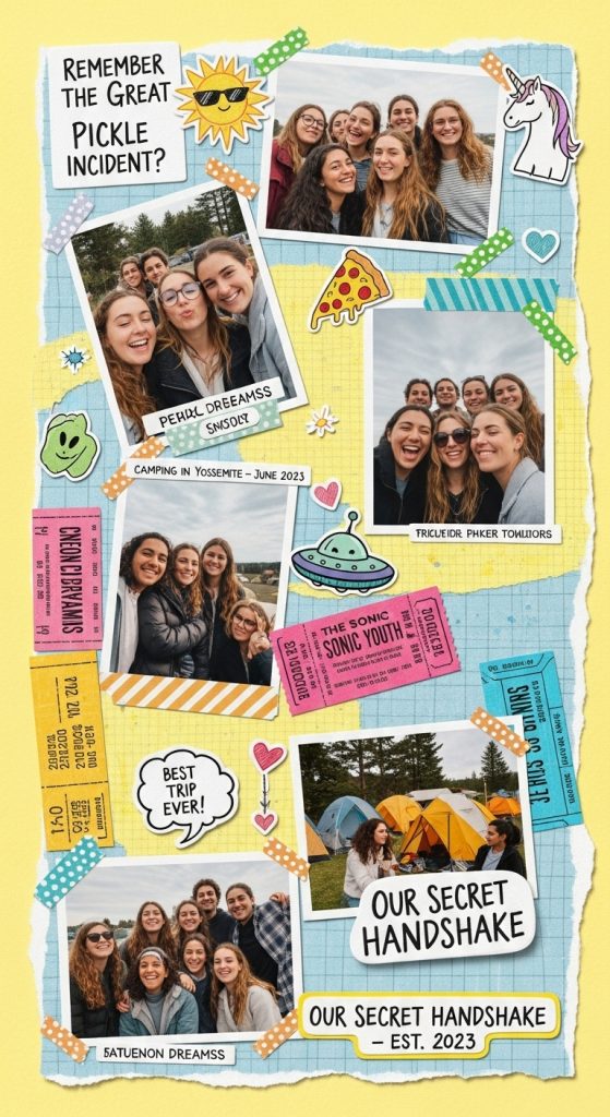 Use bright colors, doodles, and stickers that represent your shared interests. You could also create themed pages for specific trips, birthdays, or events. Another idea is to leave some space for your friends to add their own notes, doodles, or signatures, making the scrapbook a collaborative keepsake.