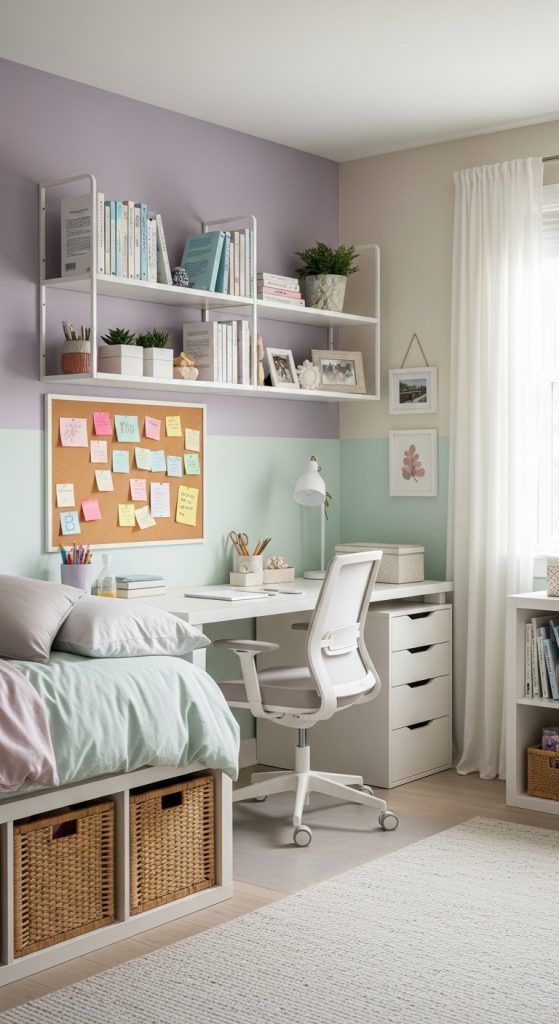 - Colors: Calming shades like soft blue, sage green, or pastel pink to encourage focus.