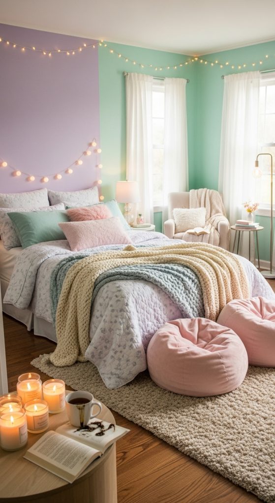 - Decor: String lights, fluffy rugs, scented candles, and layered blankets.