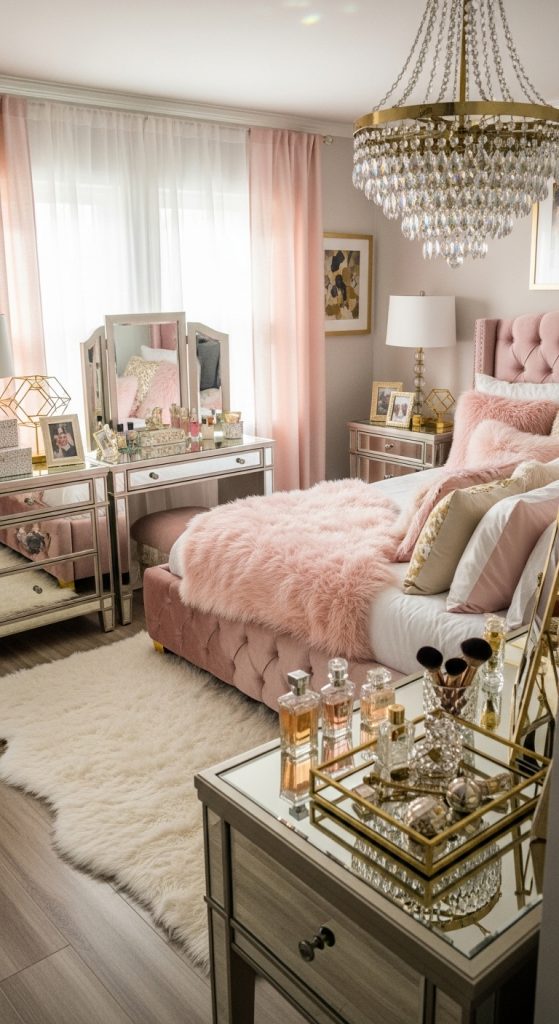 - Furniture: Upholstered beds, mirrored dressers, and a stylish vanity for makeup and accessories.