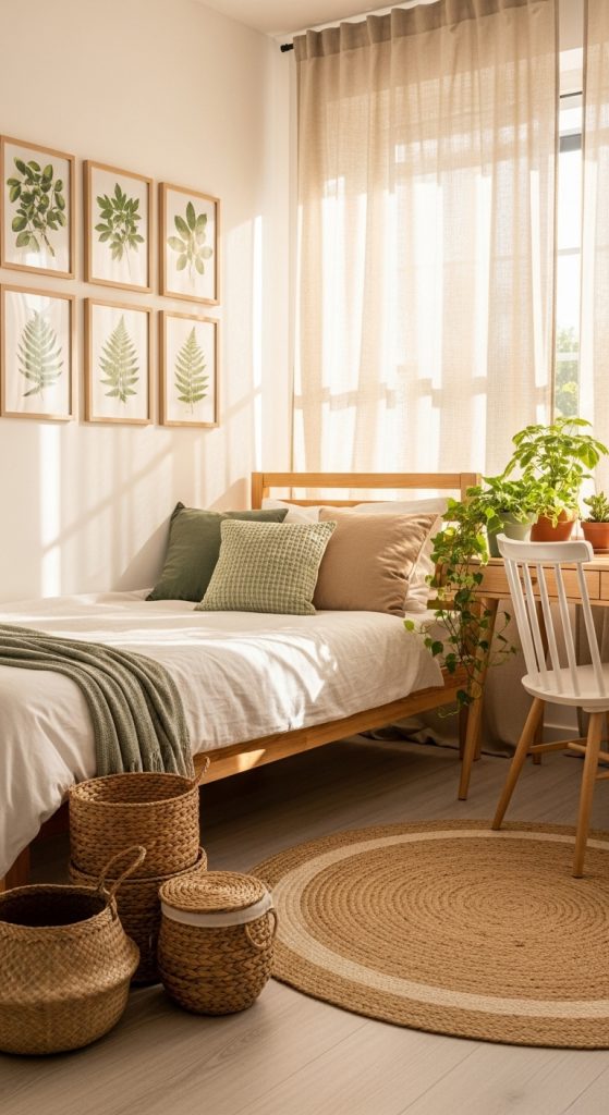 - Decor: Potted plants, botanical wall art, and natural textures like jute rugs and linen curtains.