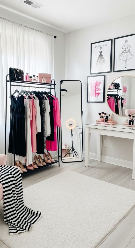 - Decor: Framed fashion prints, a clothing rack for outfits, and a chic mirror.